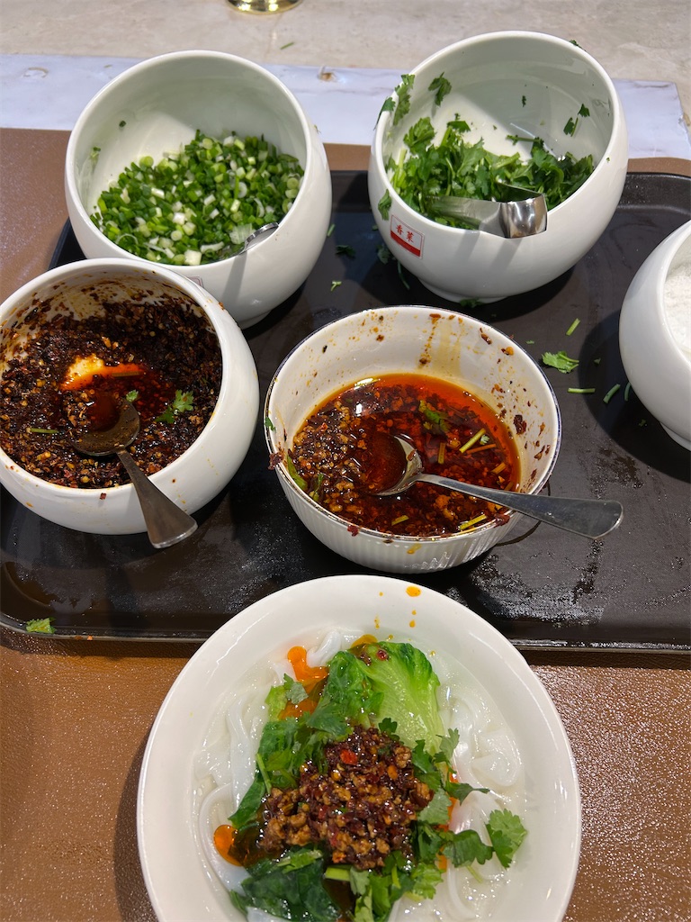 パクチーと山椒&唐辛子の効いたちょっと辛めのソースをかけて食べる。すごく好きな味。中国でしか食べれない感じで良い!
