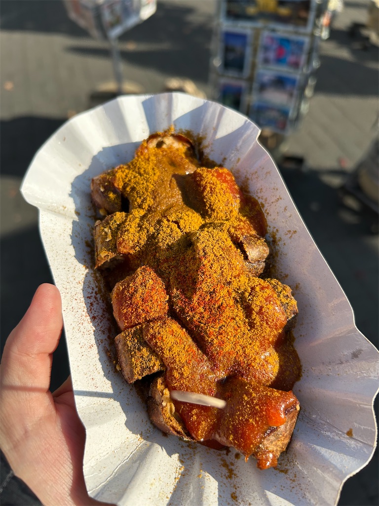 ソーセージは柔らかくて美味しい!口の中で溶ける。昔はソーセージ嫌いだったけど、2年前にドイツで食べて以降結構好きになってる。スパイシーにしてもらったけどこれは正解🙆🏻♀️